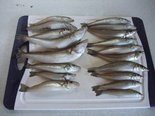 去年と同じポイントをパラシュートアンカーで流す。小さめのキスが入れ食い。食べごろサイズはなかなかこない。ピンギスは泳がせ用にキープしておく。