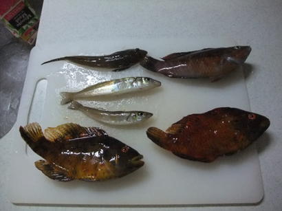 和田浜にむかうが魚の気配がないので小網代にむかう。一投目でカサゴ。その後ベラ3匹。