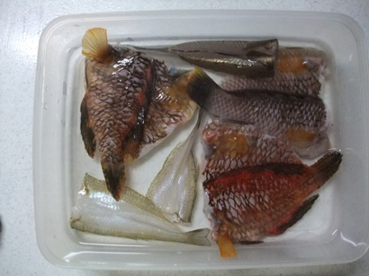 これらはすべて干物にすることにした。はらわたをだしてから塩水につけているところ。べらの干物はなかなかおいしい。