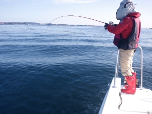 砂地を流すがアジが時々かかるのみ。船長も竿を出すことができ、30cm級1匹釣り上げた。