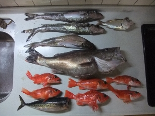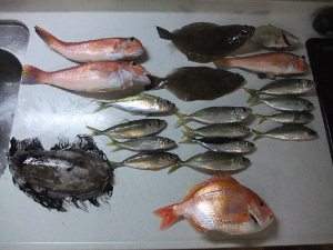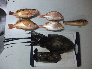 釣果:モンゴウイカ(800g)、スミイカ(200g)、メバル2、キダイ2、ヒメ1