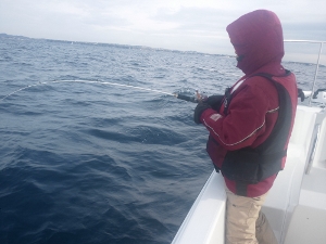 マリーナの大先輩が、「今日の相模湾はうねりが大きい」と教えてくれる。港から出ると短い周期でうねりが押し寄せてきて危ない状況。すぐに引き返し、東京湾側に移動。こちらはだいぶ状況がマシだったので、30m付近でティップランを始める。魚信がないまま30分くらいすると海況が悪くなってきた。港内に避難。