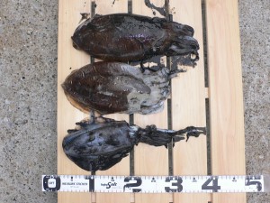 相模湾側の港内でエギングとNS釣法を試すが、魚信なし。10時くらいに状況がよくなってきたように見えたので、相模湾側のいつもの鉄板ポイントでティップラン始める。しばらくして船長にヒット。かなり大きいようなのでおくさまがタモを待機するが、バラシ。流し変えをしながら、船長のアジカラーにアオリイカがヒット。これでボウズ回避となり、ひと安心。このあと、何度かヒットとバラしがあった後、おくさまが紫エギで800gのモンゴウイカを釣り上げた。今日は風があって流れが早いので、エギを50gにしたのが良かったようだ。その後、港出口よりに移動してながし始めるとすぐにイカの気配。しばらくしてキロアップのモンゴウイカがヒットした。