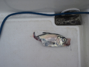 あまりに魚信がないので場所を変えた一投目、シロムツがきた。その後もシロムツが連続してかかる。しかもいつもより大きい。まぐれでキンメが上がってきたが極小だった(浮いてしまったのでキープ)。