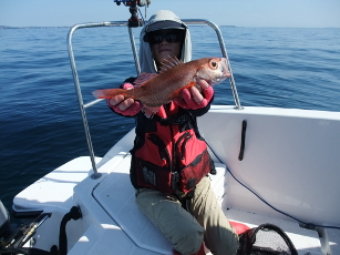 お昼前にY氏に大きなはっきりとした魚信。Y氏は手持ちで頑張っているため、すぐに合わせを入れ、巻上げ開始。あと30mで一暴れしたので本命と確信。42cmのアカムツだった!