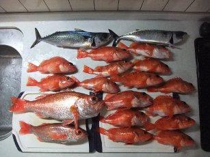 今日はシロムツが全く釣れず、ユメカサゴばかり。そのユメカサゴの魚信も遠のき、もうすぐ潮止まりというところで、オーナーと船長に魚信。オーナーは今日2回も仕掛けを無くしているので、とにかく釣り上げたい。これもあと30mと10mで暴れたので、本命を期待しながら上げると、アカムツとユメカサゴの一荷!船長はサバ。