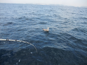 カモメが見守る中、亀城沖いつもより海岸に近いポイント300m弱で始める。周りにはPFなどスモールボートが結構いたのに驚いた。よくこの海況でここまで来るなー。