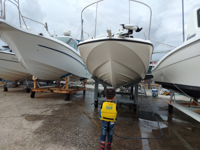 帰港後BLUEFIN号を洗うT隊員。