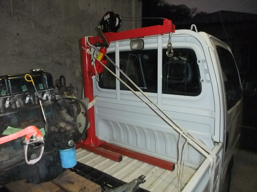 | 2014/1/26 アウトリガー、カウンターウェイトがないのでロープで補強した。これがこの後窮地を救うことに。 外は暗くなってきたが今日中にエンジンをトラックからおろせるだろうか。 |