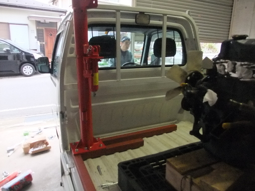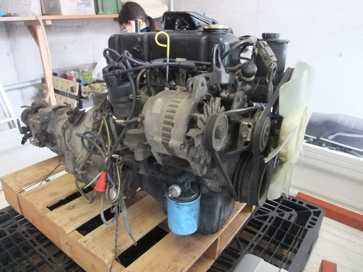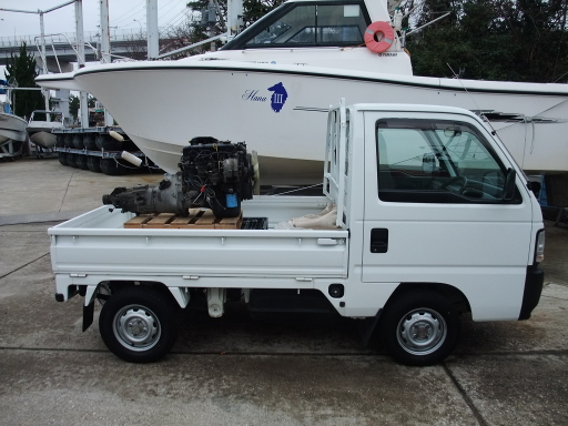 | 2014/1/25 A15+5速トランスミッションがきた。ミッションはコラムシフト用だった。マリーナにてパーツ引取とトラックへの積み込みをお願いした。 | |