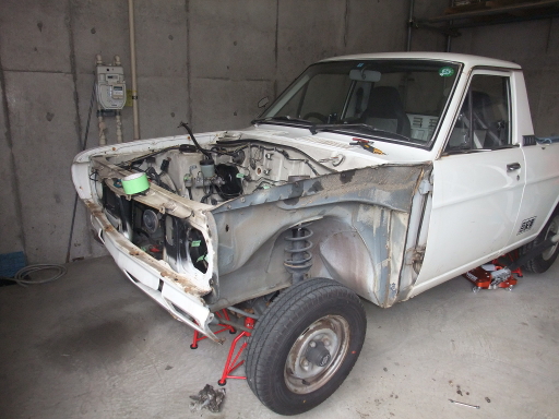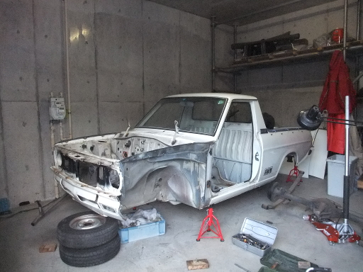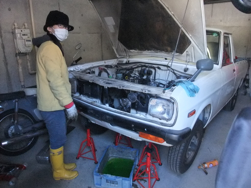 | 2014/2/16 サニトラ本体の作業再開。今日外したもの。ラジエター、エグゾーストパイプ、プロペラシャフト、フロントグリル、バンパー、エアフィルター、バッテリー、その他もろもろ配線・配管。 | |