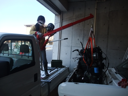 | 2014/2/22 エンジンを吊った。ミッションとは切り離しておいた。 | |