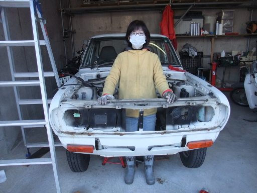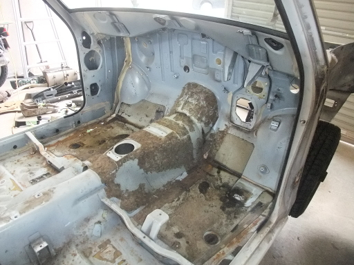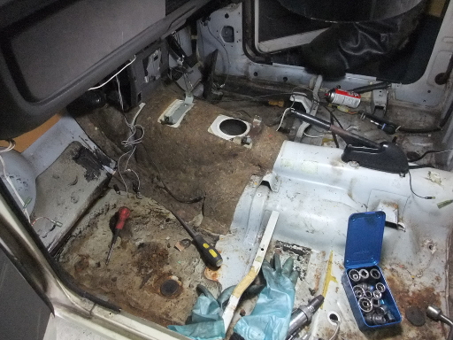 | 2014/3/2 室内に着手。シート、内張りを外した。助手席側サビがひどく穴が開いている。それと触媒の排気温度センサーが外れない。どうしようか。左ドア外した。 | |