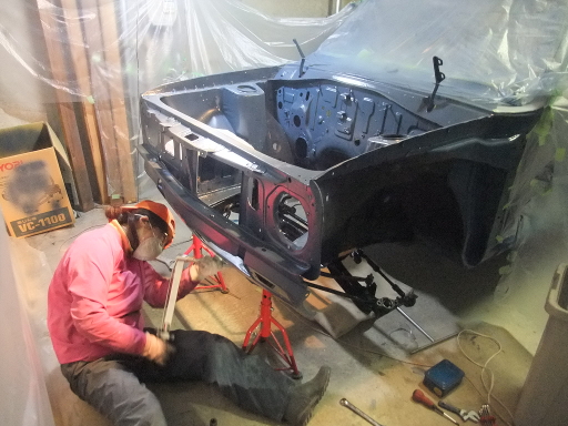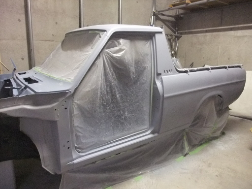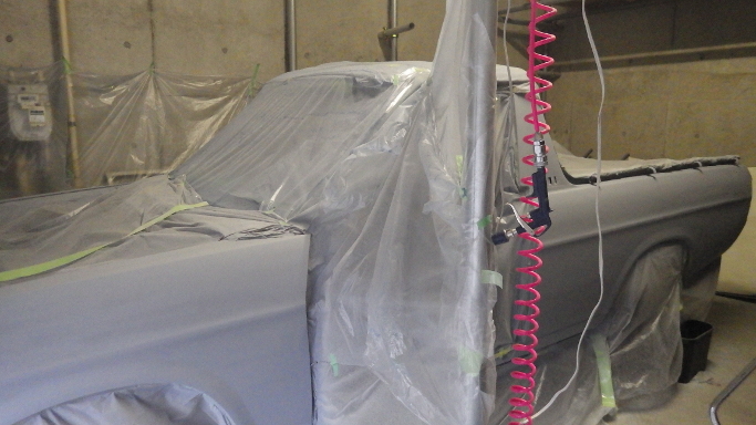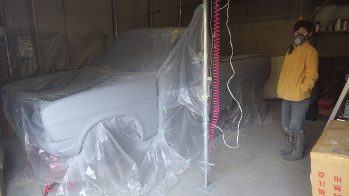 | 2014/11/09 ボディにスプレーガンでサーフェイサーを塗布。はじめてのスプレーガン。調整不足でダレてしまった。 | |