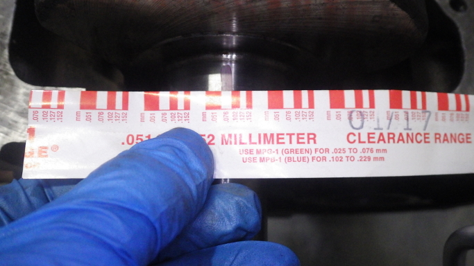| 2017/12/10 メインメタルのオイルクリアランスを測定。5つすべて0.06-0.07ぐらい。基準0.02-0.05だが限度0.1なのでまあいいか。 | |