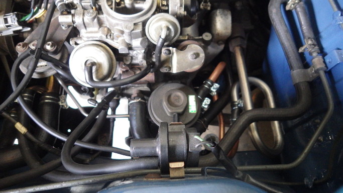 | 2018/6/3 冷却水を抜きインテーク・エギゾーストマニホールドを下ろす。エギゾーストマニホールドにはO2センサー用の穴をあけM18ピッチ1.5のタップを切る。インテークマニホールドにはM12ピッチ1.5のタップを切り水温センサー取り付け。TVバルブ(水温により負圧をオンオフ)、VVTバルブ、EGRバルブを取り付ける。EGR配管が車体に干渉してしまう。 | |