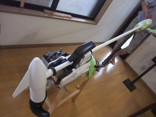 | ミンコタをイケアの脚立に固定。電源には車からはずしたバッテリーを用意した。 | |
