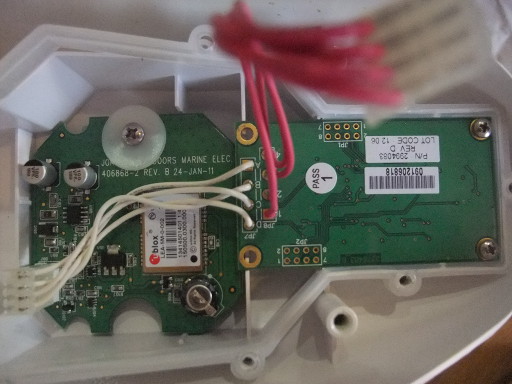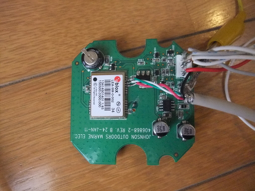 | ヘッド部は養生テープで仮固定。オリジナルのボードは電源部を修理すると再び信号を出すようになったので取り付けてみた。arduinoで受信するがやっぱり文字化け。ボードから回路図を起こしてみると可能性のある2つの原因が判明した。 ・GPSとミンコタの通信は3.3V。arduinoで読み取るには5Vにする必要がある。 ・GPSレシーバの出力はインバータによって反転されている。 インバータをバイパスして5Vに変換する回路を組み、arduinoに接続すると測位できた。しかしながら表示された現在地は300m以上離れた住宅地。ボードをミンコタに戻してみるとやっぱりステアリングが回ってしまい、最高回転になる。移動していないのに速度表示が1ノット以上でることもあって不安定。やっぱり原因はGPSボードなのかもしれない。 ミンコタからGPSボードへは何も送信されていないこともわかった。 | |