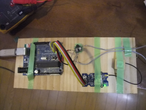 | Grove GPSを買ってきた(右下)。Baud rateはディフォルトで9600bpsなので4800bpsに落とす必要がある。この設定は表面実装のモジュールの15番ピンをオープンにする。ピンに付いているはんだを吸い取るが難しい。なんとかハンダがとれて4800bpsで通信できた。GPS測位の結果はArduinoのシリアルモニタでもわかるがu-bloxの評価用のソフトウェアu-centerで見ると楽しい。左はArduino、中央の小さい基板は12→5Vのレギュレータ。 | |